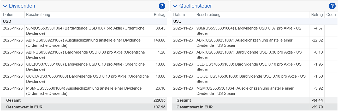 Nach Abzug der US-Quellensteuer wurde uns am 26.11.2025 eine Netto-Dividende von 127,50 US-Dollar gutgeschrieben.