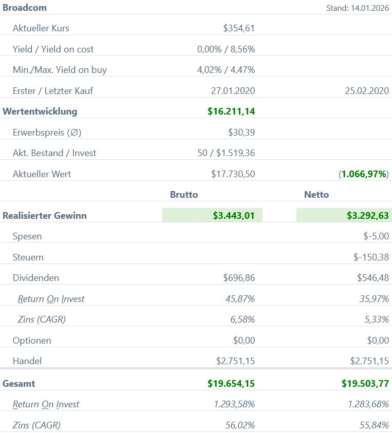 Im Vergleich zum Vorquartal stieg der Kurs der Broadcom Aktie um 15,92 US-Dollar oder 5%. Für uns bedeutet das eine Zunahme des Buchgewinns um 796,00 US-Dollar oder 5%.