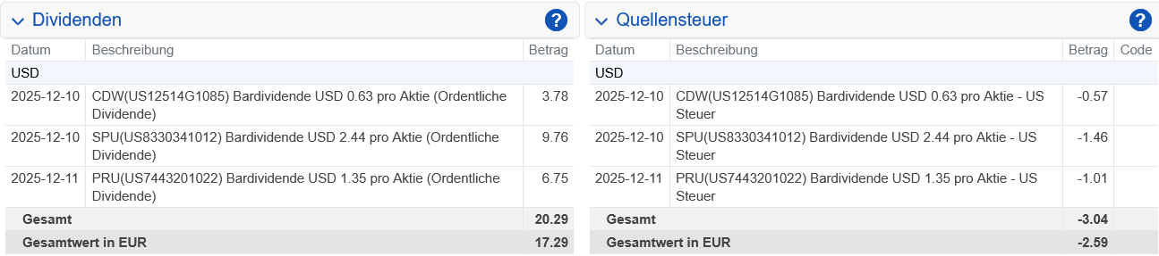Nach Verrechnung der US-Quellensteuer wurde uns am 10.12.2025 eine Netto-Dividende von 5,35 US-Dollar gutgeschrieben.