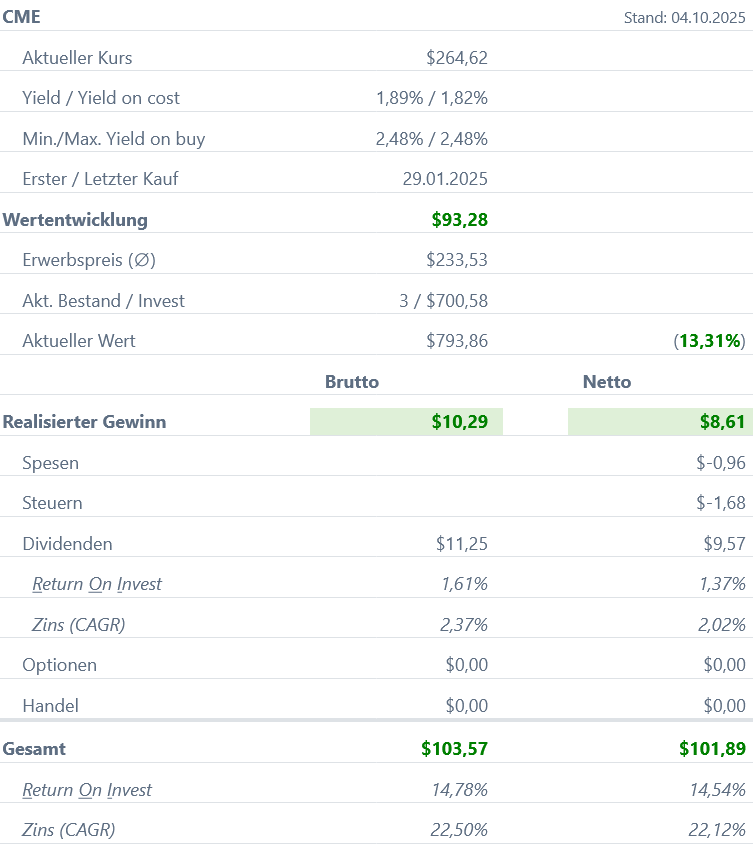 Die Aktie befindet sich seit dem 29.01.2025 im SchwarzGeld-Depot. Wir besitzen 3 CME Aktien aus einem Kauf.