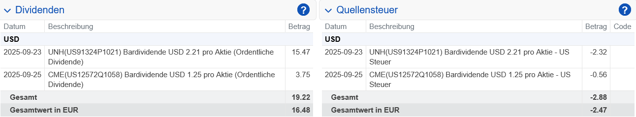 Nach Abzug der US-Quellensteuer wurde uns am 25.09.2025 eine Netto-Dividende von 3,19 US-Dollar gutgeschrieben.