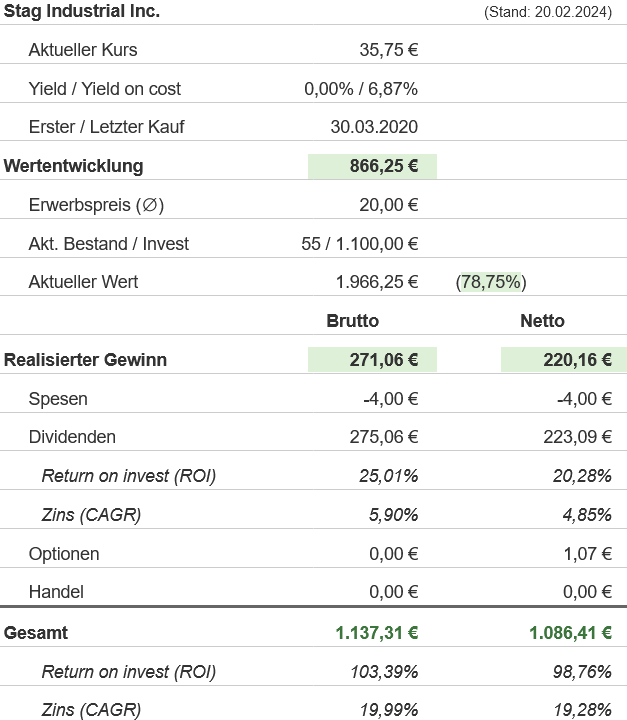 Wir besitzen 55 STAG Industrial Aktien. Unser Einstiegskaufkurs lag bei 20,00 Euro. Zum Zeitpunkt unseres Kaufs lag die Dividendenrendite bei 7,2%.