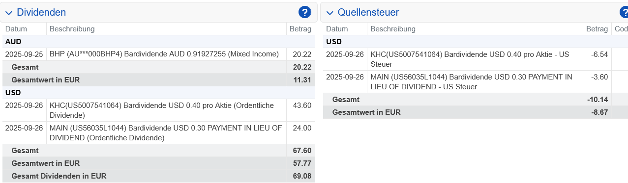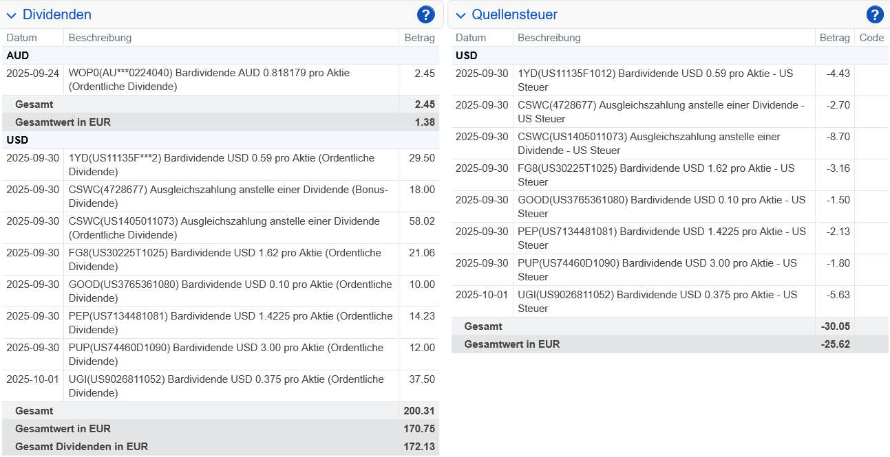 Nach Verrechnung der US-Quellensteuer wurde uns am 26.09.2025 eine Netto-Sonderdividende von 20,39 US-Dollar gutgeschrieben.