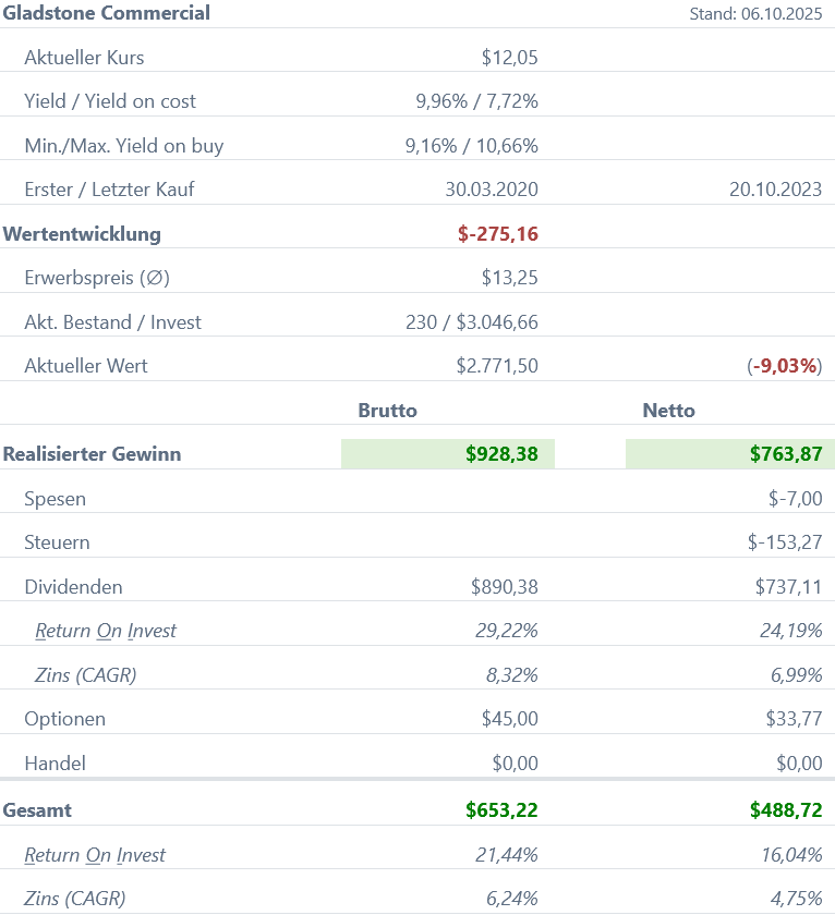 Zusätzlich zu den Dividenden konnten wir bislang mit Gladstone Commercial 45,00 US-Dollar durch den Optionshandel erwirtschaften.