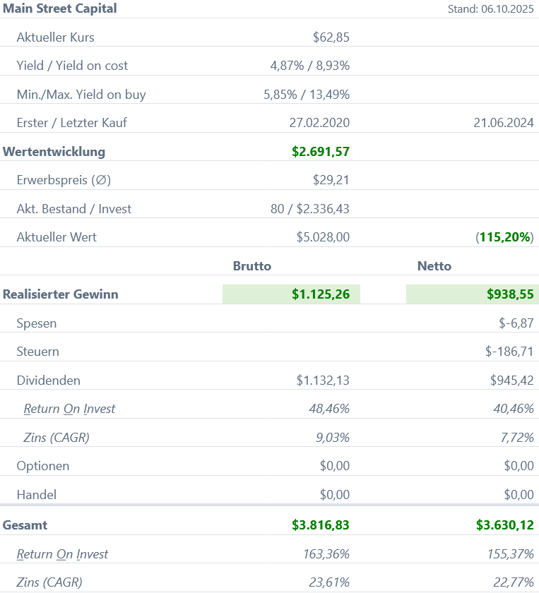 Zusätzlich zur regulären Dividende schüttete Main Street Capital im September 2025 eine Sonderdividende in Höhe von 0,30 US-Dollar je Aktie aus.