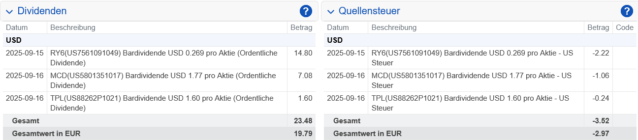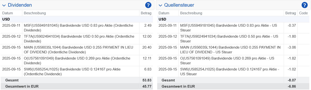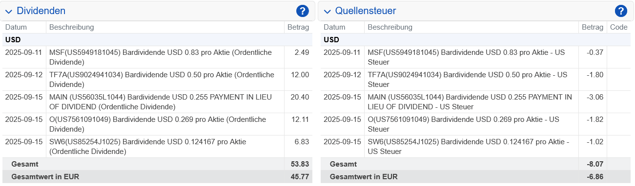 Nach Verrechnung der US-Quellensteuer wurde uns am 15.09.2025 eine Netto-Dividende von 22,87 US-Dollar gutgeschrieben.