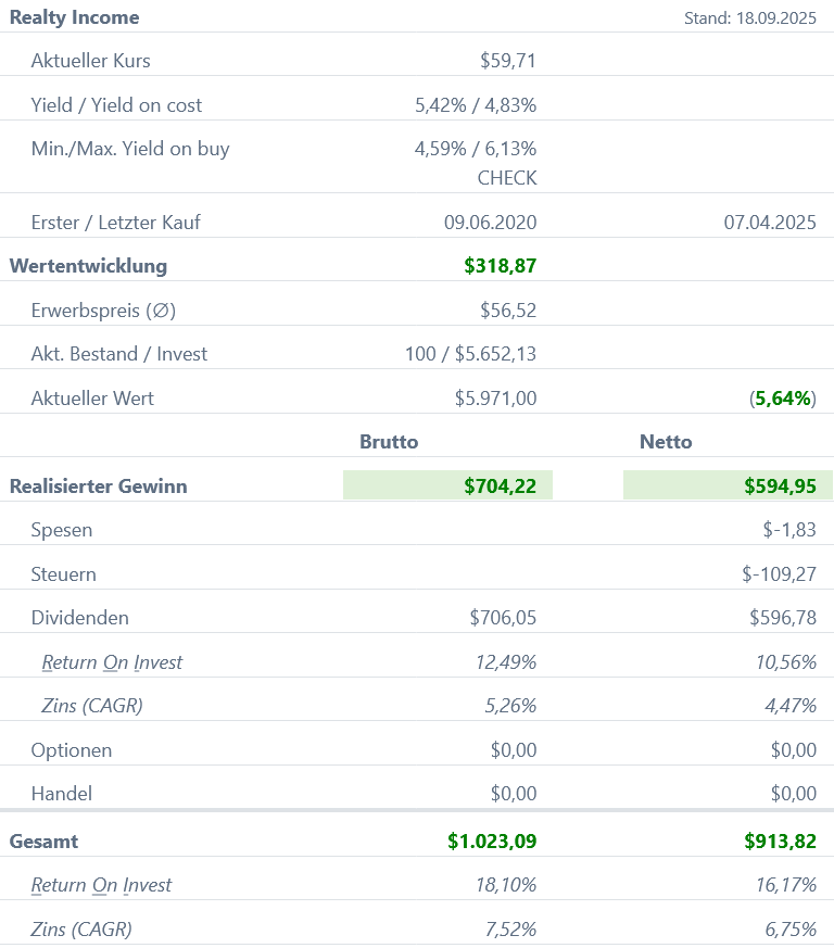 Damit sinkt unser Yield on Cost (bezogen auf den Euro-Wert) zum 15.09.2025 von ursprünglich 4,47% kommend über zuletzt 5,49% auf 5,45%.
