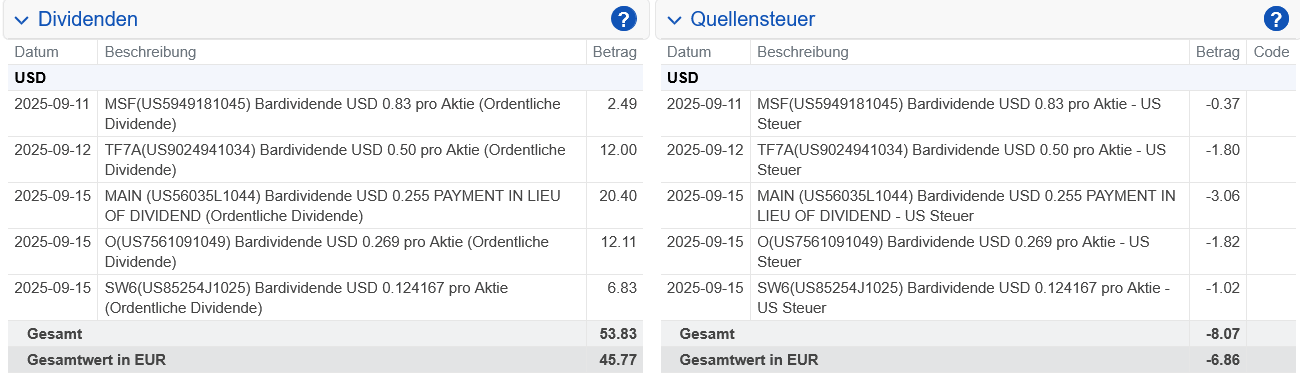 Nach Verrechnung der US-Quellensteuer wurde uns am 15.09.2025 eine Netto-Dividende von 17,34 US-Dollar gutgeschrieben.