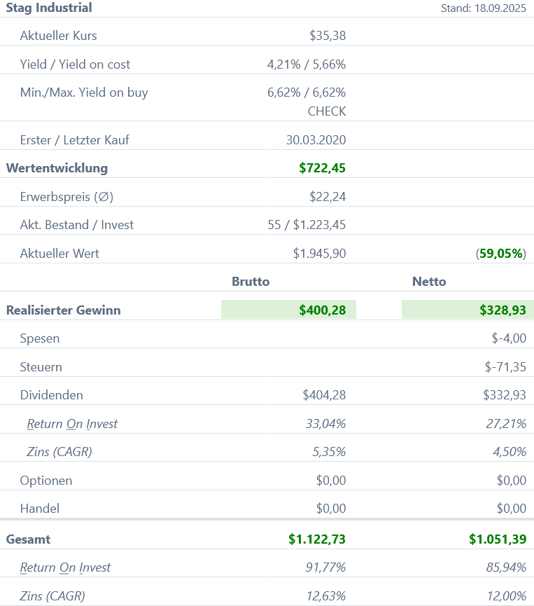 Wir besitzen 55 STAG Industrial Aktien. Unser Einstiegskaufkurs lag bei 20,00 Euro.