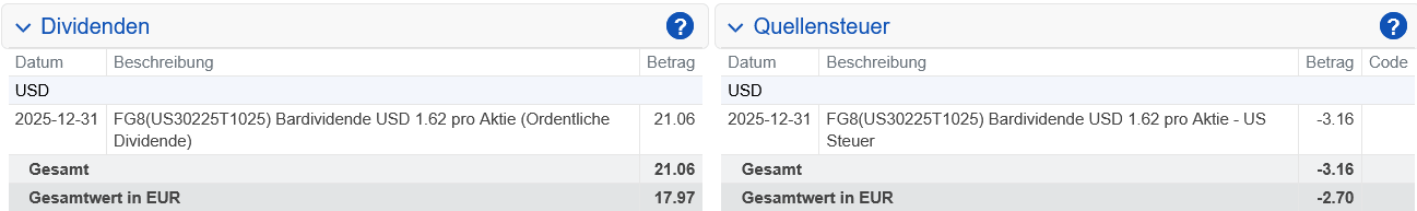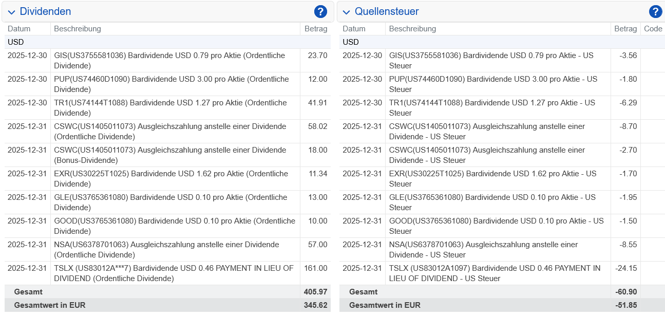 Nach Verrechnung der US-Quellensteuer wurde uns am 31.12.2025 eine Netto-Dividende von 27,54 US-Dollar gutgeschrieben.