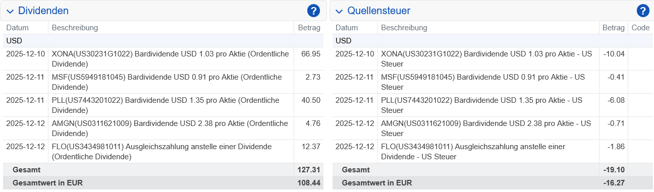 Nach Verrechnung der US-Quellensteuer wurde uns am 10.12.2025 eine Netto-Dividende von 56,91 US-Dollar gutgeschrieben.
