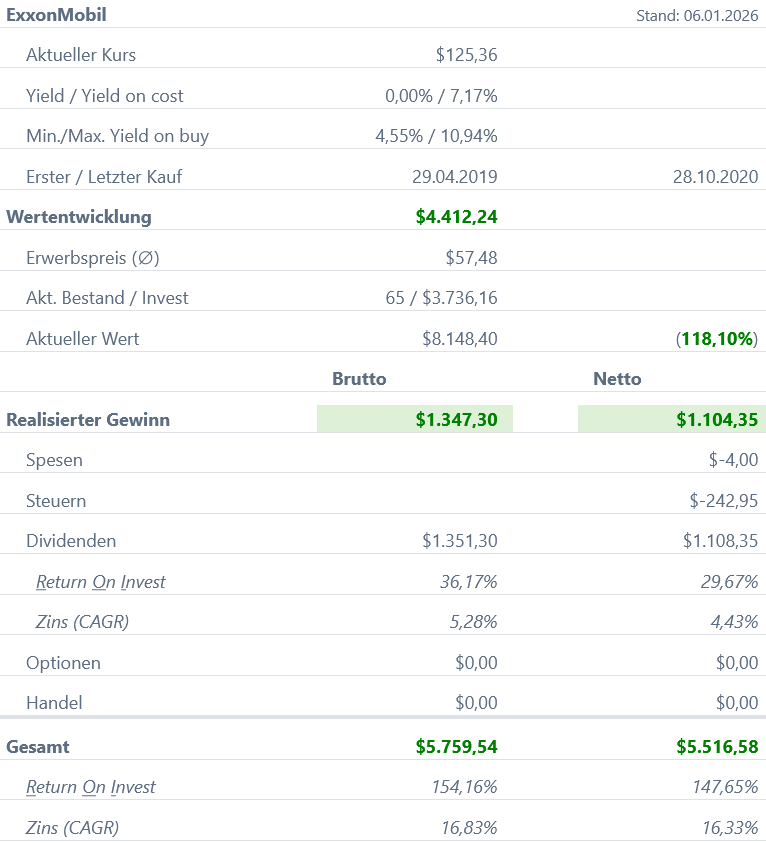 Die Aktie befindet sich seit dem 29.04.2019 im SchwarzGeld-Depot. Am 28.10.2020 kauften wir letztmalig Aktien des Unternehmens nach. Wir besitzen 65 Exxon Aktien aus drei Käufen.