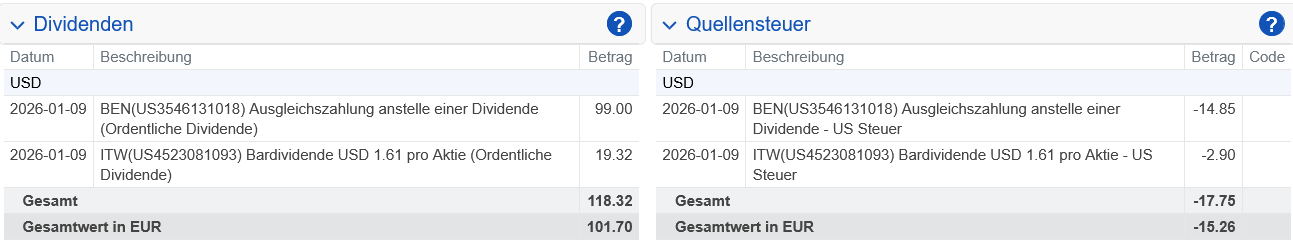 Nach Abzug der US-Quellensteuer wurde uns am 09.01.2026 eine Netto-Dividende von 84,15 US-Dollar gutgeschrieben.