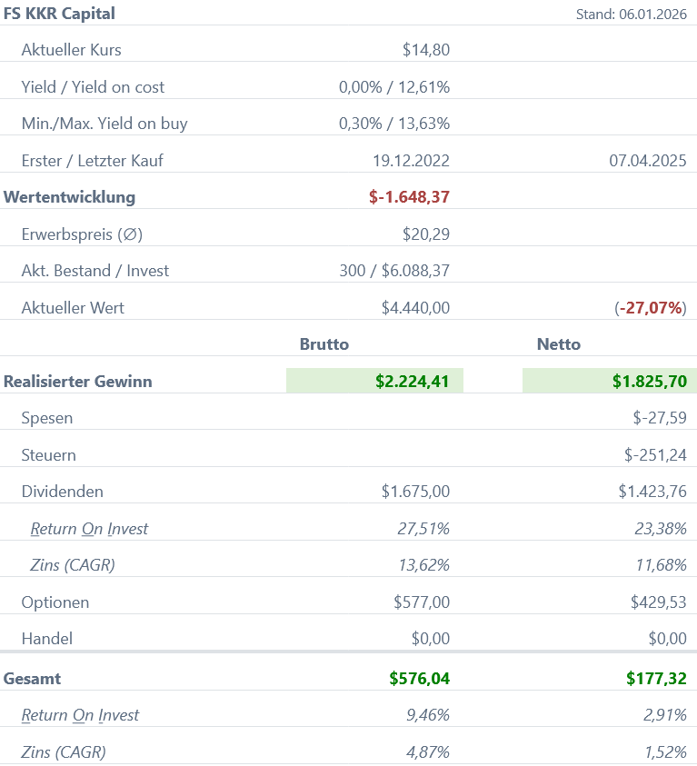 Zusätzlich zu den Dividenden konnten wir bislang mit FS KKR Capital 577,00 US-Dollar durch den Optionshandel erwirtschaften.