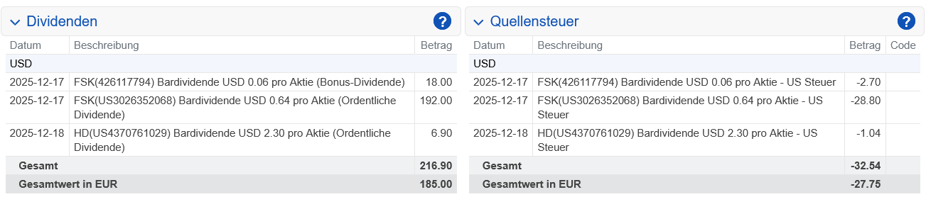 Nach Abzug der US-Quellensteuer wurde uns am 17.12.2025 eine Netto-Dividende von 178,50 US-Dollar gutgeschrieben.