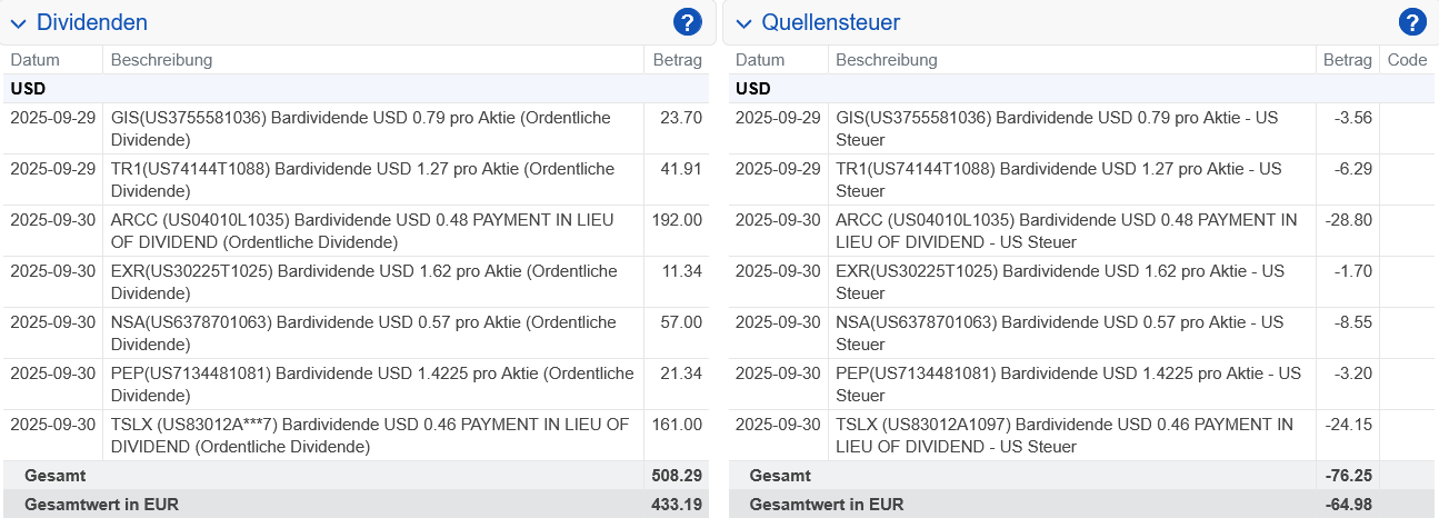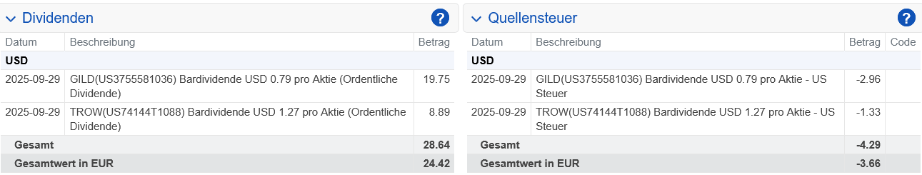 Nach Verrechnung der US-Quellensteuer wurde uns am 29.09.2025 eine Netto-Dividende von 36,93 US-Dollar gutgeschrieben.