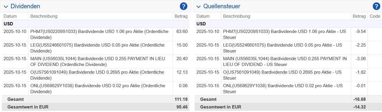 Nach Verrechnung der US-Quellensteuer wurde uns am 15.10.2025 eine Netto-Dividende von 14,45 US-Dollar gutgeschrieben.