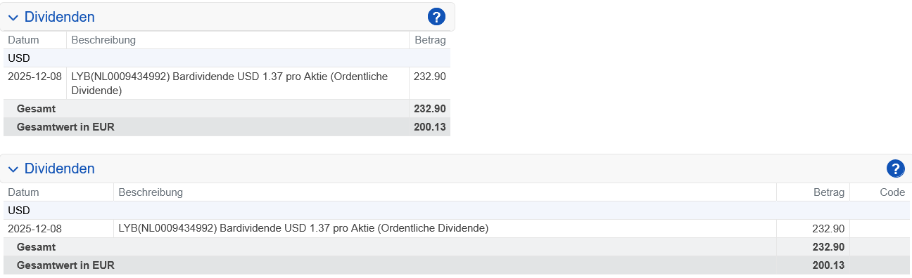 Ohne Abzug einer Quellensteuer wurde uns am 08.12.2025 eine Netto-Dividende von 232,90 US-Dollar gutgeschrieben.