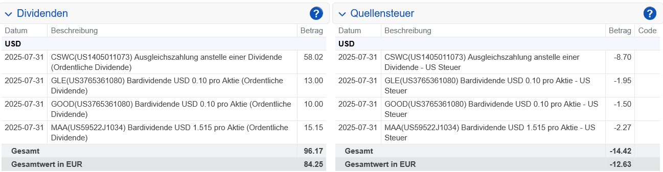Nach Abzug der US-Quellensteuer wurde uns am 31.07.2025 eine Netto-Dividende von 12,88 US-Dollar gutgeschrieben.