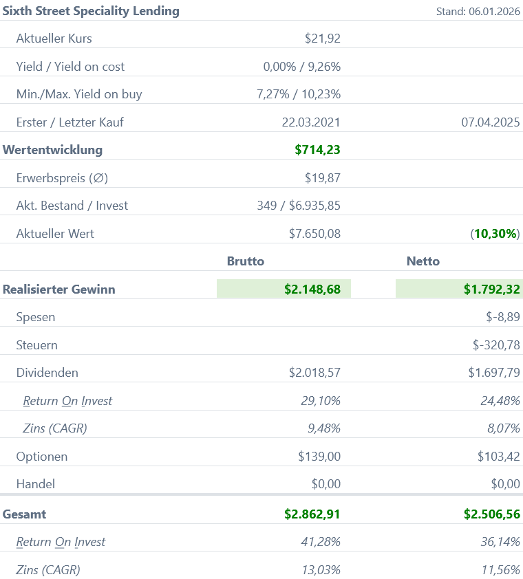 Zusätzlich zu den Dividenden konnten wir bislang mit Sixth Street Specialty Lending 139,00 US-Dollar durch den Optionshandel erwirtschaften.