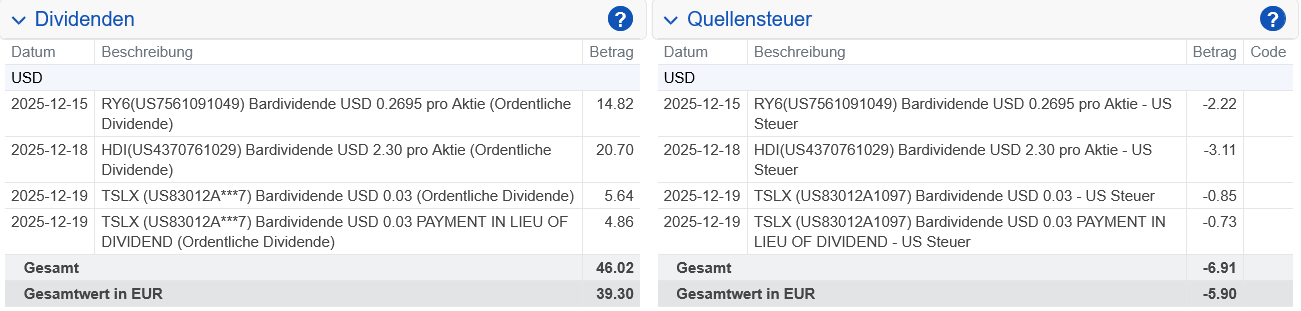 Nach Verrechnung der US-Quellensteuer wurde uns am 19.12.2025 eine Netto-Sonderividende von 8,92 US-Dollar gutgeschrieben.
