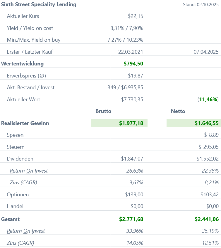 Zusätzlich zu den Dividenden konnten wir bislang mit Sixth Street Specialty Lending 139,00 US-Dollar durch den Optionshandel erwirtschaften.