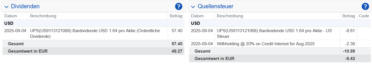 Nach Abzug der US-Quellensteuer wurde uns am 04.09.2025 eine Netto-Dividende von 48,79 US-Dollar gutgeschrieben.