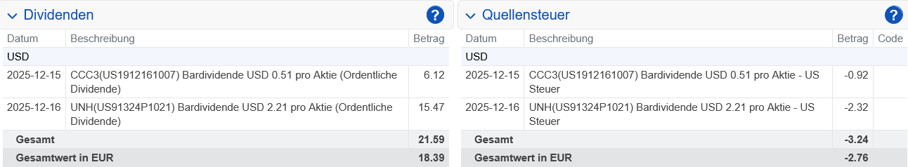 Nach Verrechnung der US-Quellensteuer wurde uns am 16.12.2025 eine Netto-Dividende von 37,57 US-Dollar gutgeschrieben.